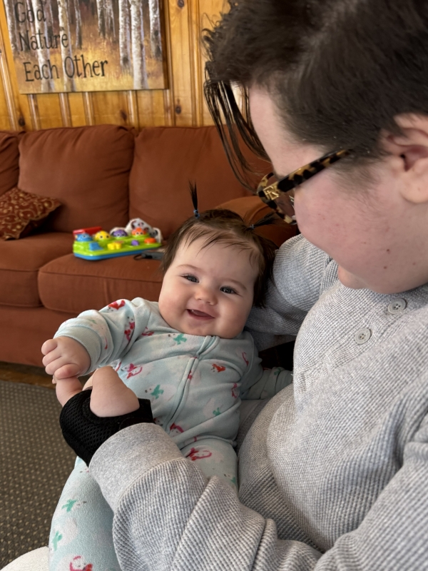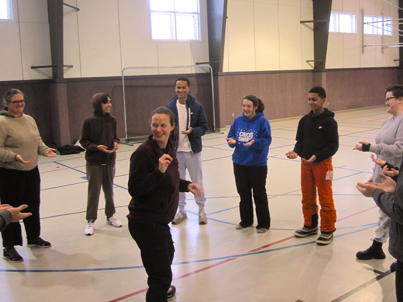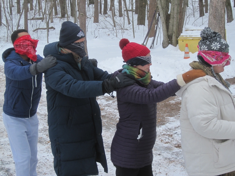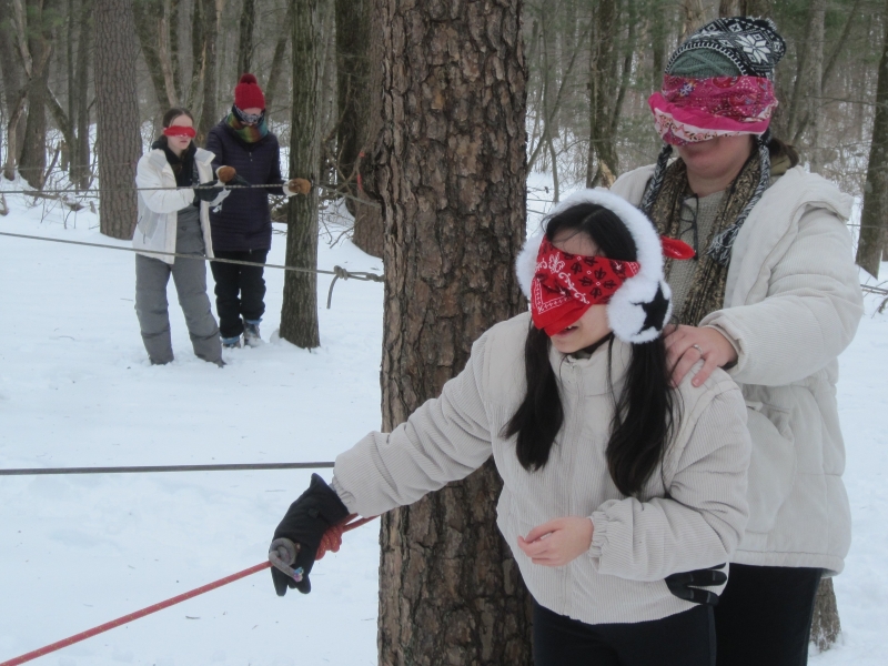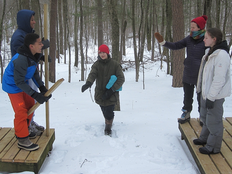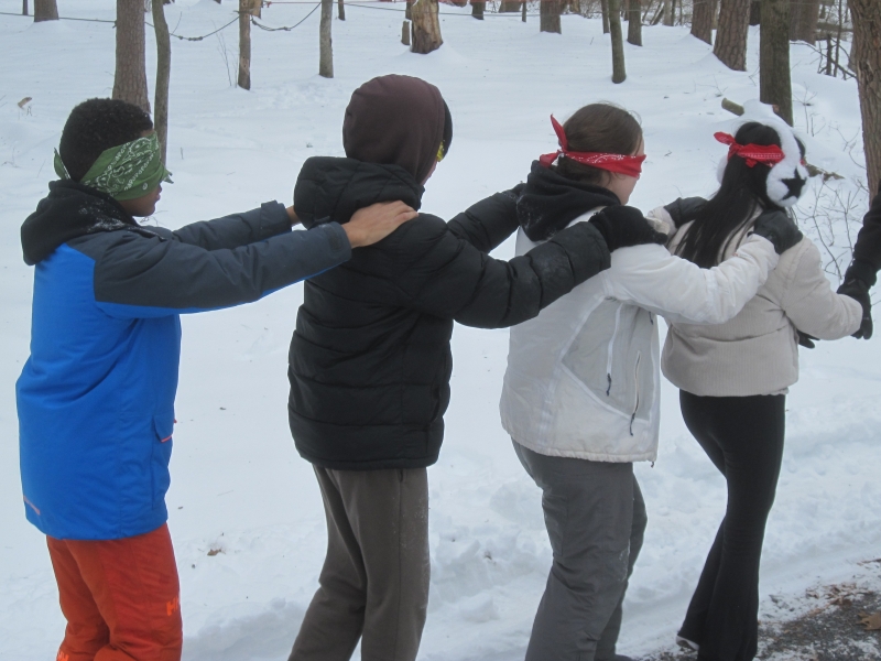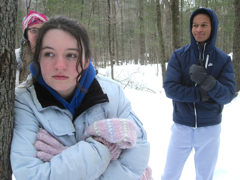 Where is the kingdom of God in the middle of all the evil going on in the world? We collaged what we think it might look like.Randy and Sally came along to do some babysitting.Who gave that boy the camera?On Saturday morning, we did Camp Hebron’s challenge course. Here, in the indoor portion, Michelle gets a sneaky look as she prepares to slap some hands. And onto the outdoor portion. Here, Sam, Jeremi, Sylvie, and Hannah are blindfolded and led away into the snowy wasteland.Isaiah, Jacob, Michelle, and Emily go too. Each of us has to follow the ropes to find our partner, whom we recognize by the secret handshake we’ve agreed on beforehand.Sylvie and Michelle have been reunited. So have Hannah and Emily. Now they have to find a way out of the rope maze.Emily, Noura, and Isaiah think deep thoughts as they wait for the others to finish.How can we cross this gap with only two planks of wood, neither of which will reach the whole way?And of course, we took turns entertaining the littles. Here, Caitlyn makes Hazel giggle.