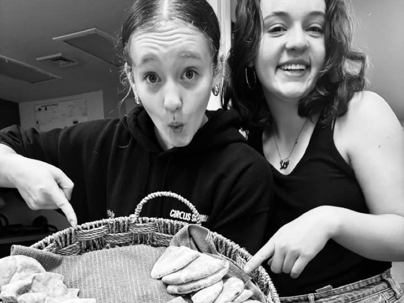 Sylvie and Noura show off the pita breads that will hold the m’sakhan.