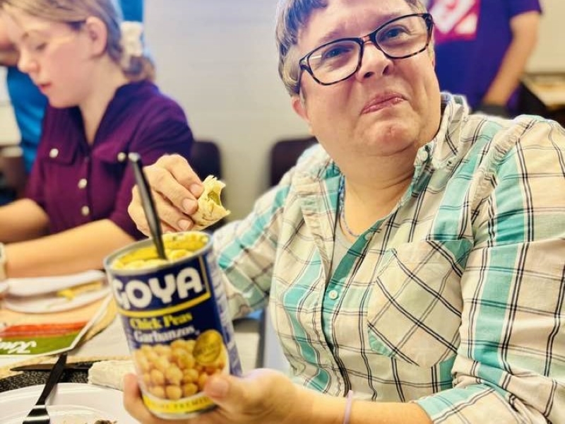 Vicki considers her hummus-in-a-can.