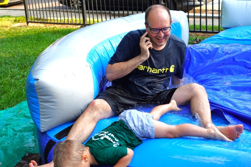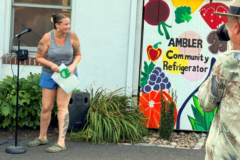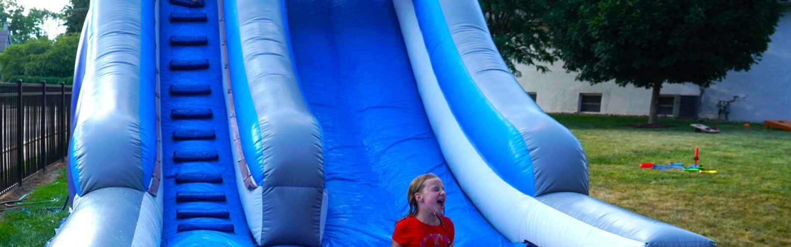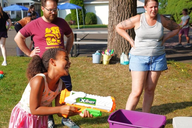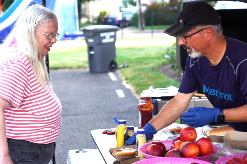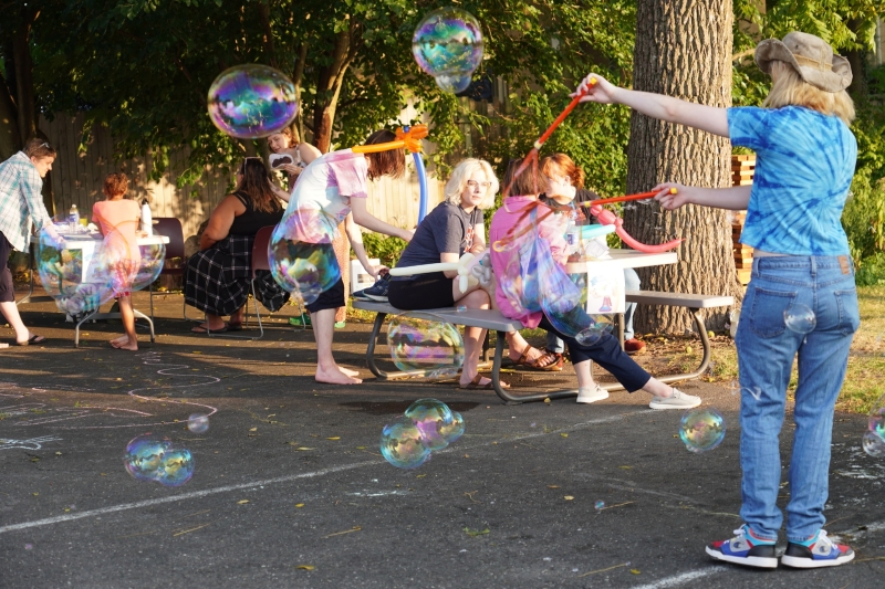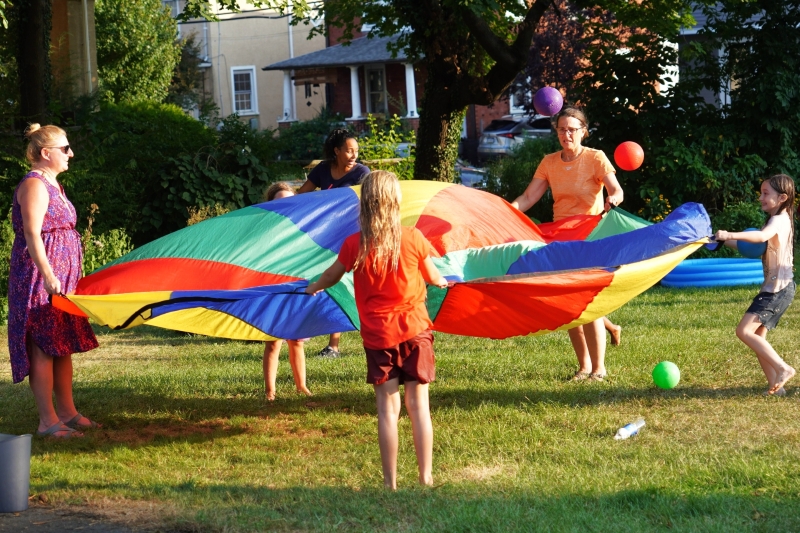 On Saturday, August 16, from 5:00 to 7:00 pm, this church threw a rockin’ party. Folks came to our corner of Spring Garden Street and Mount Pleasant Avenue from all over Ambler and beyond. A lot of them were children. They bought raffle tickets, they ate hot dogs, they got their faces painted, they got balloon animals, they blew bubbles, they squirted water guns, they drew with chalk on the parking lot, they bounced balls, they shot rockets, and they slid. Oh my did they slide. And all the proceeds went to the Ambler Community Fridge.